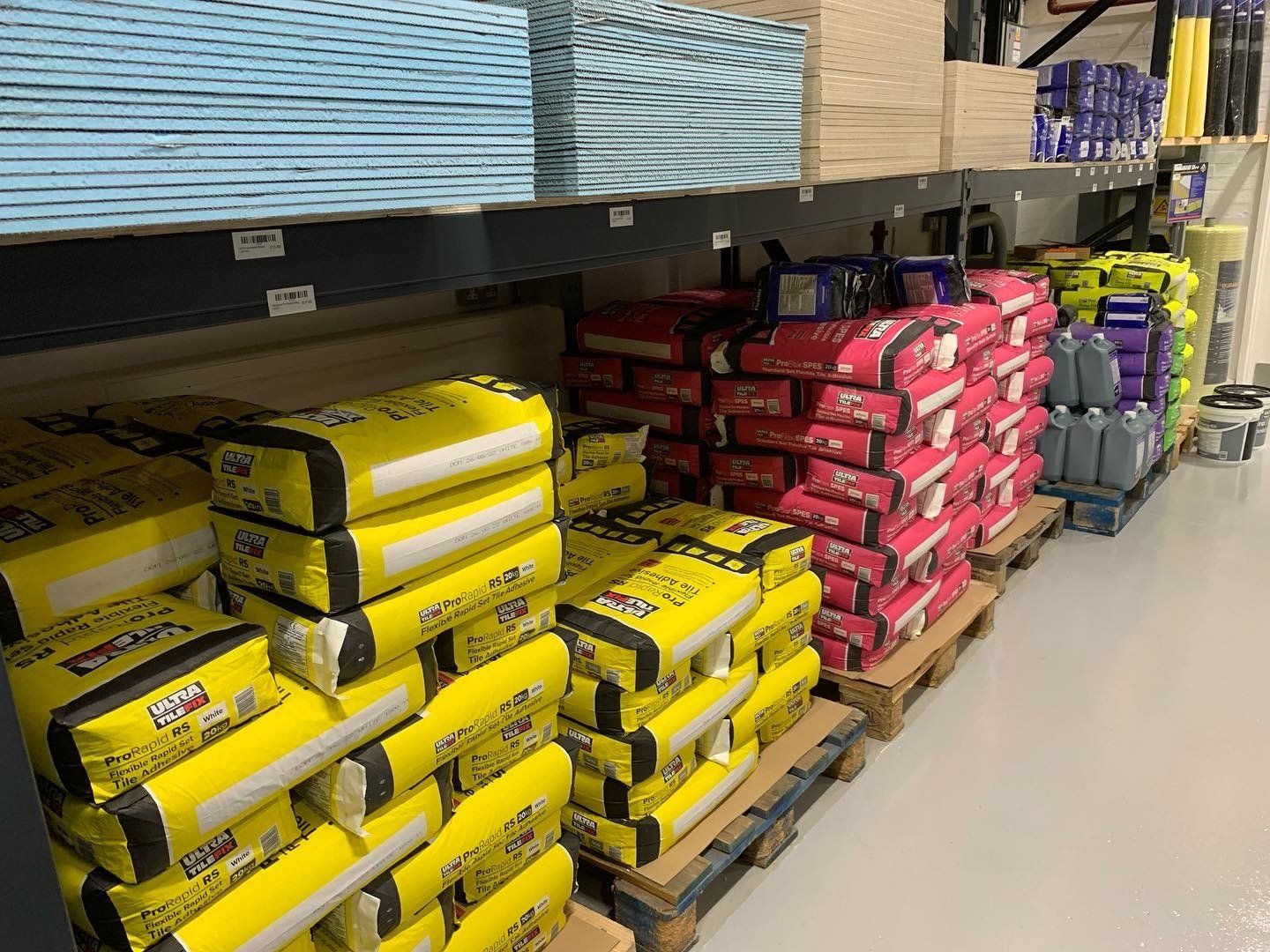 Adhesives, levelling components, grouts, insulation boards, cement boards, matting...